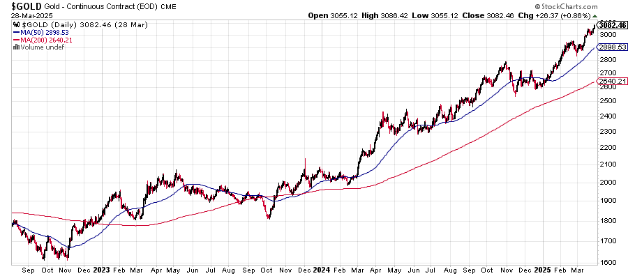 This is that same time frame for gold front month futures presented as a continuous contract. Neither one has even tested its 200-day SMA from above since late 2023.