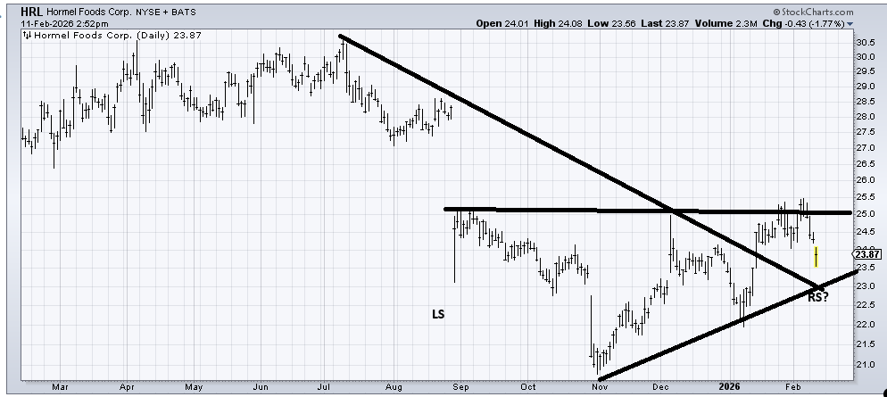 Hormel (HRL) is trying to map out a bottom. As long as it doesn’t break under that 22-23 area, it ought to be okay down here.
