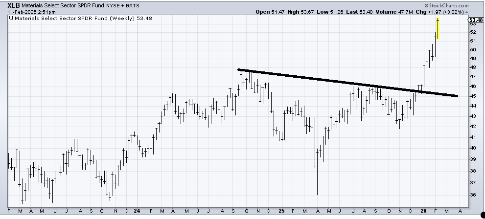 I first warmed up to (XLB) , an ETF to be long the materials sector, back in late November. It hasn’t done anything wrong, but it is (on this weekly chart) over-extended and in the area of a measured target in the low 50s. I would call it a hold.