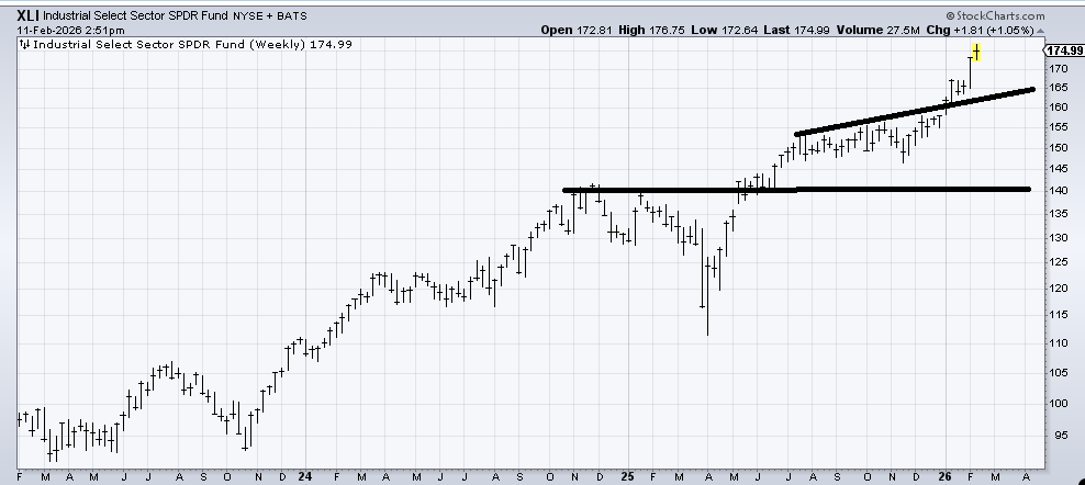 (XLY) , an ETF to be long the Industrials, is not nearly as over-extended on this weekly chart as XLB, but again, I am a terrible chaser, so I’d say pullbacks to the upper line (163-165) would be buyable.