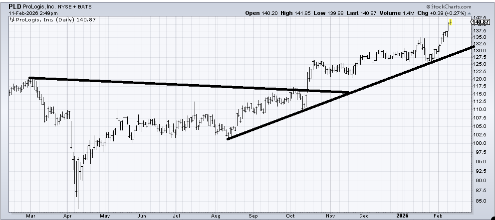 The worst thing I can say about ProLogis (PLD) is that it is at/near its measured target of 145-150. So as long as it stays over that uptrend line, I’d call it a hold. I am a terrible chaser, so it’s hard for me to get excited over the stock up here.