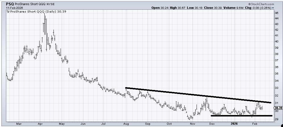 In any event, the person asked if this looked like a bottom to me. Yes, it does. But I can tell you that if this can’t get up and over 31 next week (when we get back near an overbought condition), it will be just more languishing. So, sure, if I didn’t know it was a short ETF, I’d be bottom fishing, but I can’t turn a blind eye to what the actual security is.