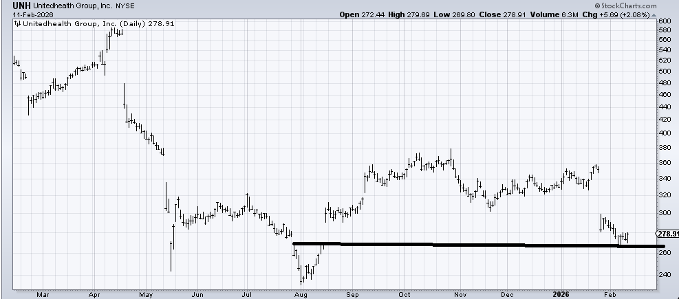 For the person who asked about United Health (UNH) last week, it did bounce, but it was today’s action that caught my eye because they tried to take it down, and instead, it bounces. I still think it is incomplete, but the risk is better now because the stop is under last week’s low.