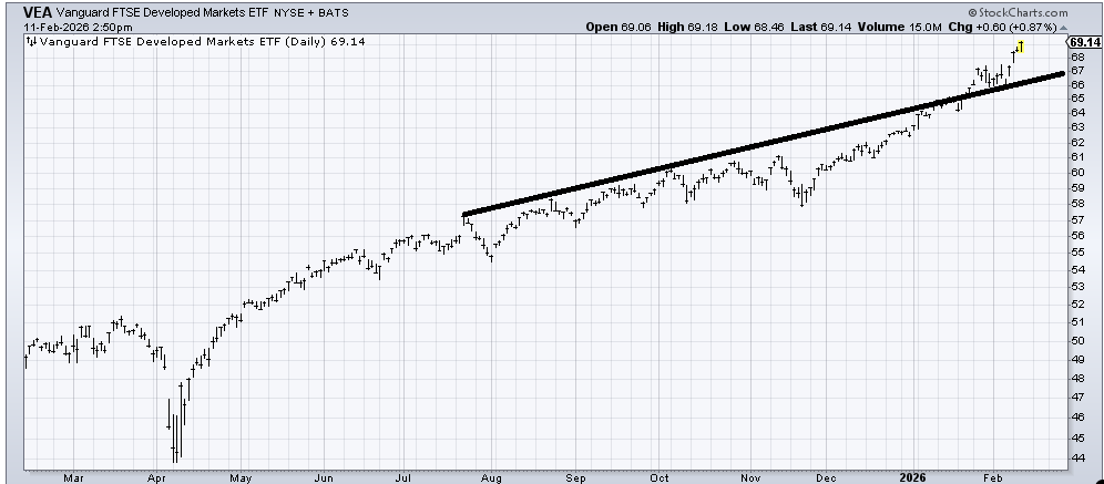 There is not much to say about the chart of (VEA) , an ETF to be long Developed Markets. It’s up and over-extended (although not too much), and pullbacks toward the line should be buyable.