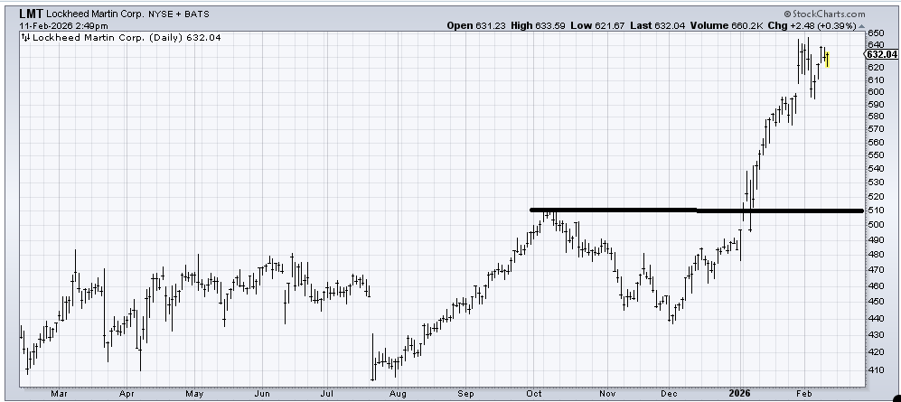 I recommended Lockheed Martin (LMT) back in early December after it appeared to make a head and shoulders bottom. That bottom had a measured target in the 580 area, which was achieved. So while it hasn’t done anything wrong, I wouldn’t argue against taking some profits. But otherwise, I would just use a trailing stop under 590-ish.