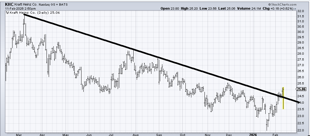 That’s nice daily action in Kraft Heinz (KHC) today, but overall, the fact that it has been able to cross that downtrend line that has been in place for a year is a positive. There is resistance all the way up, so it’s hard to call any spot a breakout. I would say the stock appears to be bottoming, albeit slowly. Pullbacks toward 23.50-24 would be okay to buy.