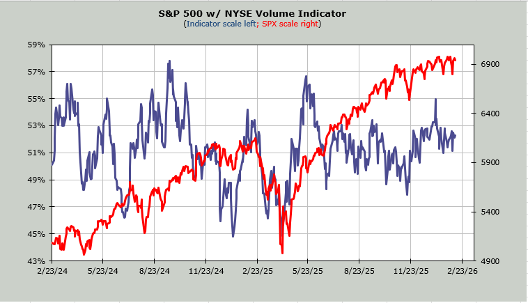 The Volume Indicator sits at 52%. It is amazing with all that breadth that this just can’t lift.
