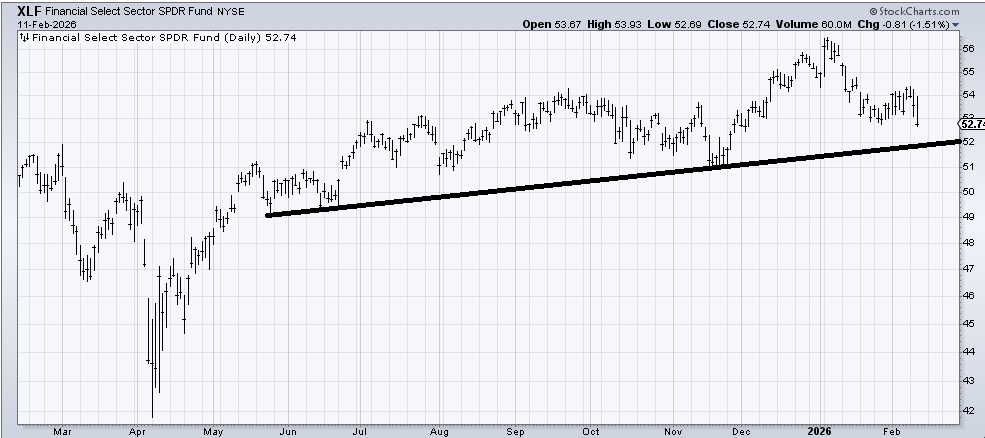 In the meantime, I always look at the banks and rarely look at (XLF) , yet XLF is much more popular than the bank indexes. I bring this up because in early January, I was concerned that the banks were too loved and they pulled back, held, and rallied. But now I see XLF is down on the year and just made a minor lower low. I suspect that line at 52 allows XLF to find support, but it’s time to put this on our radar because that is a group I believe is over-owned.