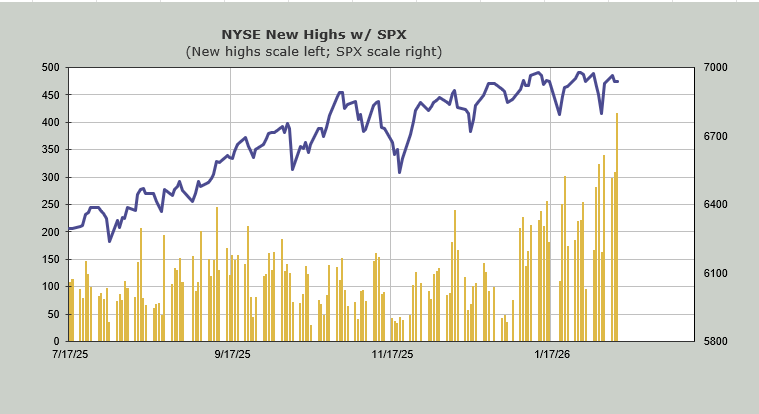 If you wanted to outperform the S&P in 2026—well, really, since October—this is your chance. The S&P is trading pretty much where it began the year (and not much higher than October), and the number of stocks making new highs on Wednesday chimed in at 417 on the NYSE, the most new highs we’ve seen. Notice at the October peak, there were 150 new highs, whereas today there were over 400.
