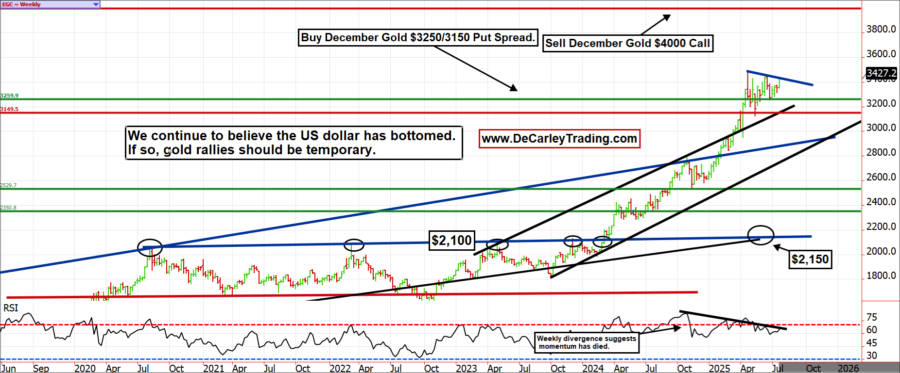 It isn't feasible to provide a complete option trading course in a short online column, but the premise of this type of strategy is to use the market's money to finance our speculations. In other words, we would like to be long a gold put, but buying the $3,250 put outright would incur a cost and risk exceeding $4,000. Even in 2025 dollars, this is a substantial amount of money.