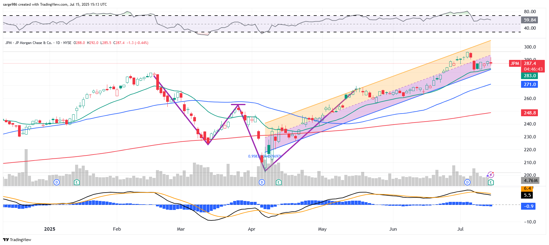 Readers will see that JPM broke out from a rather sloppy double-bottom pattern of bullish reversal this past spring with a $255 pivot. ​The Raff regression model illustrates the uptrend in place since that breakout. If you've been in this name with me, then it's not core to your book and you're probably only up about 21% on the trade.