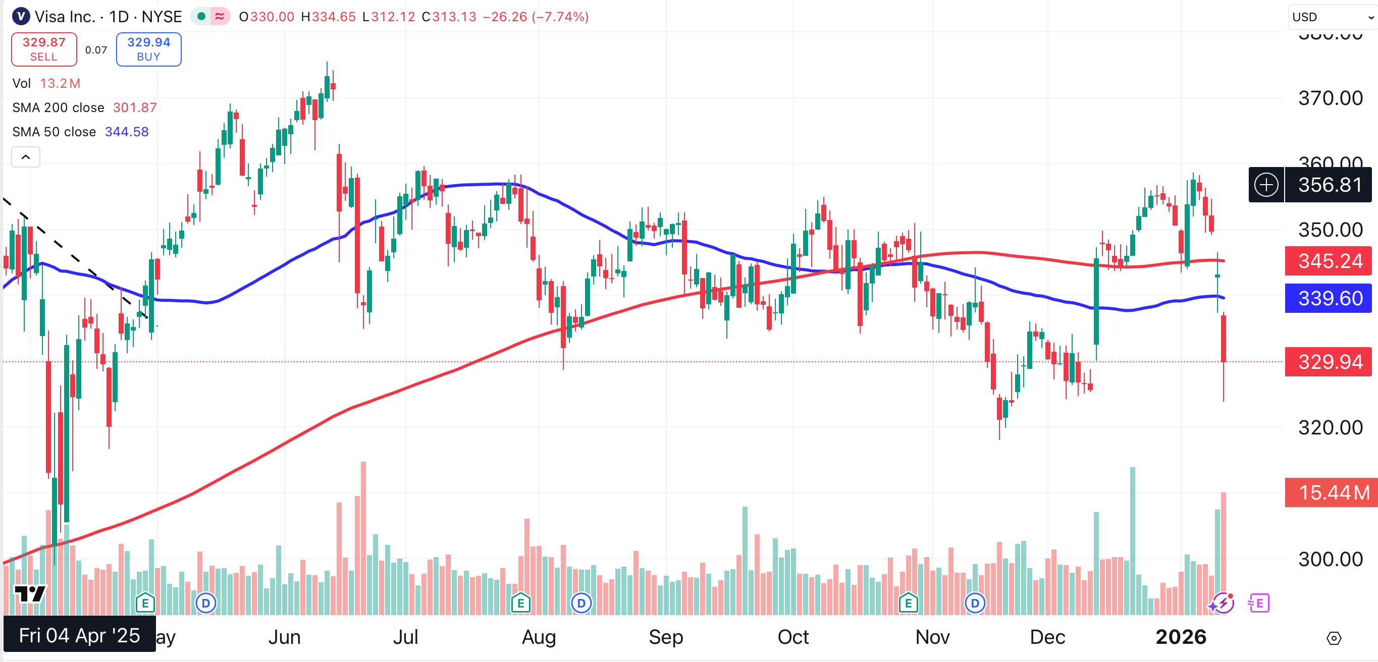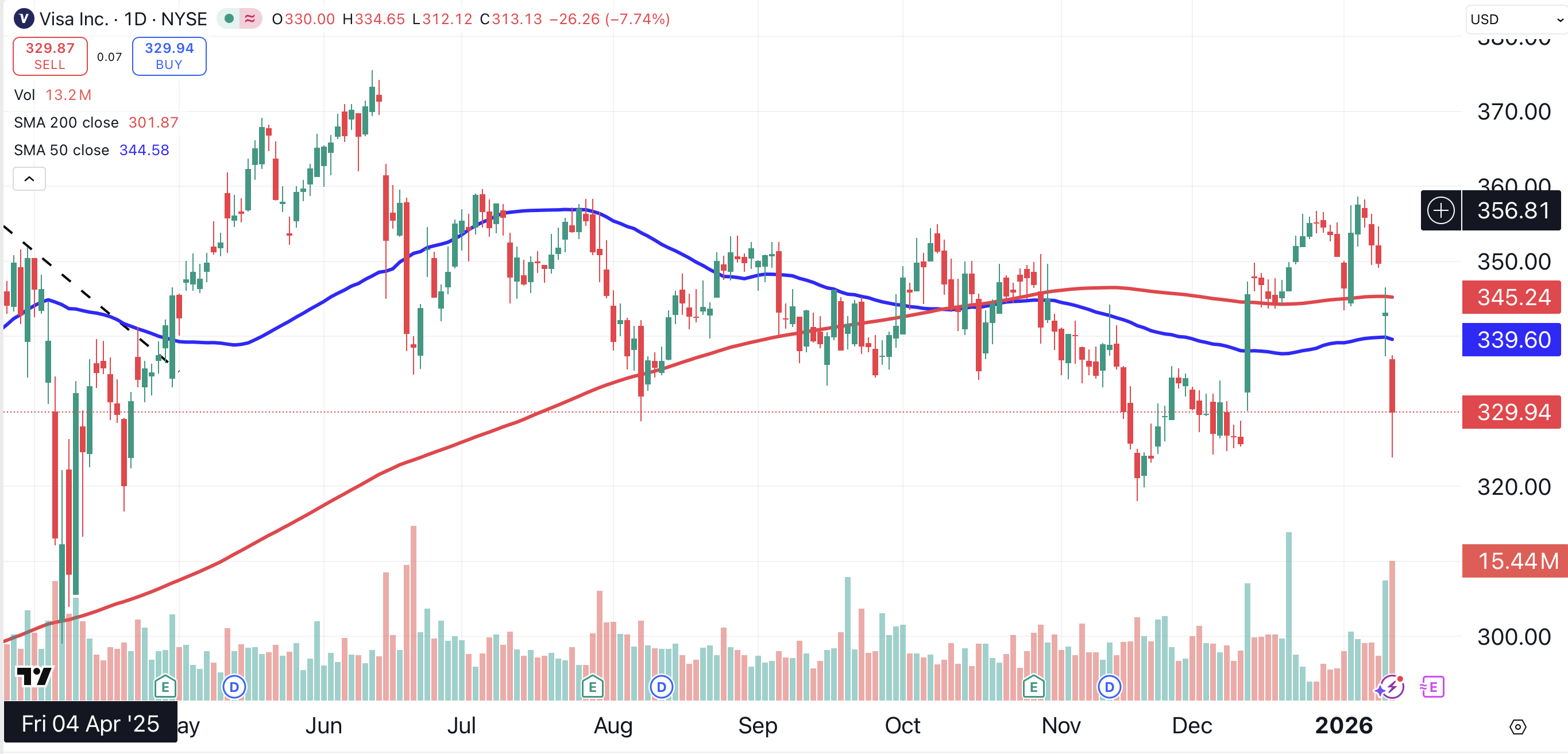 Visa reacted by falling 3.5% on Tuesday. Shares of the San Francisco-based credit provider have now lost 7.5% since reaching a six-month closing high on Jan. 6.