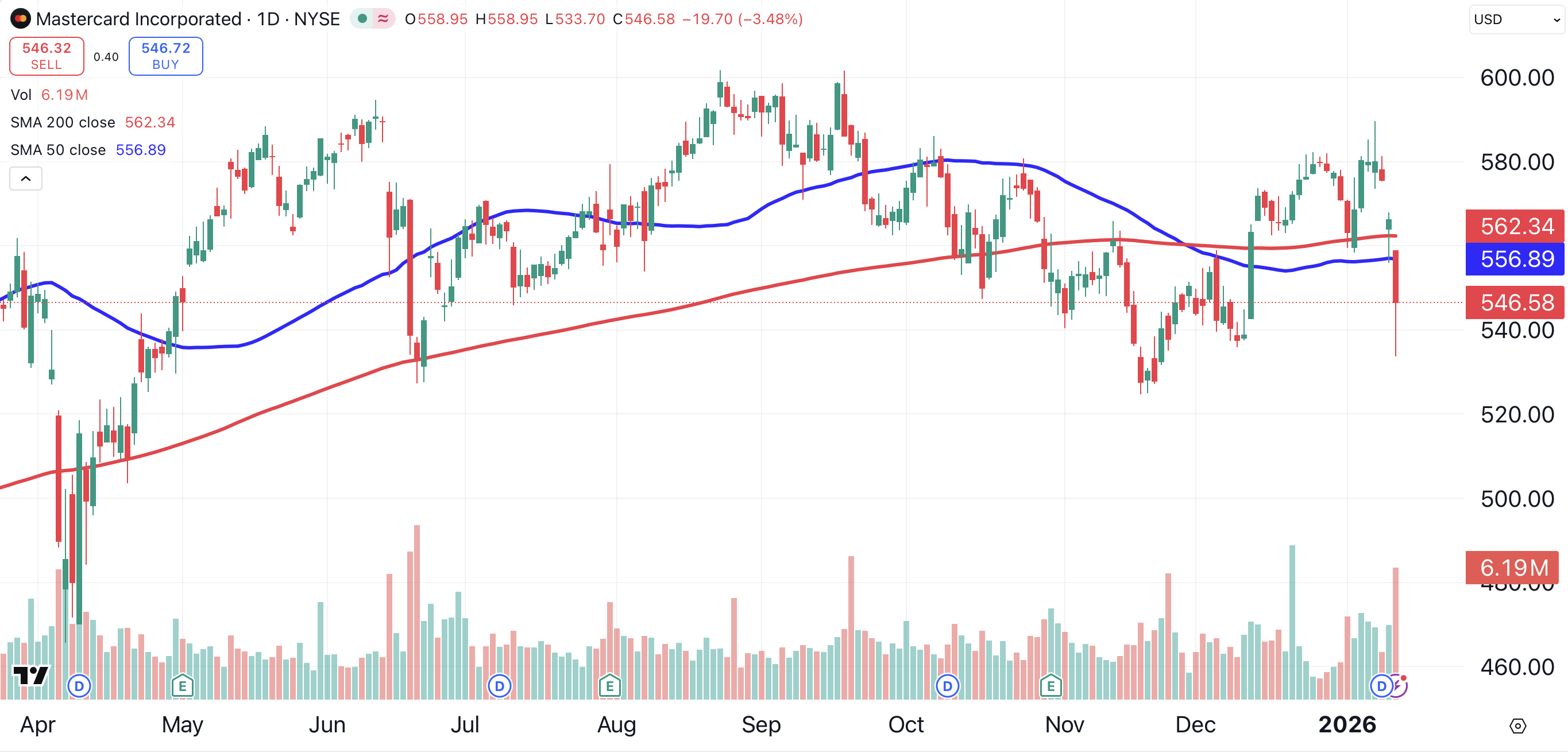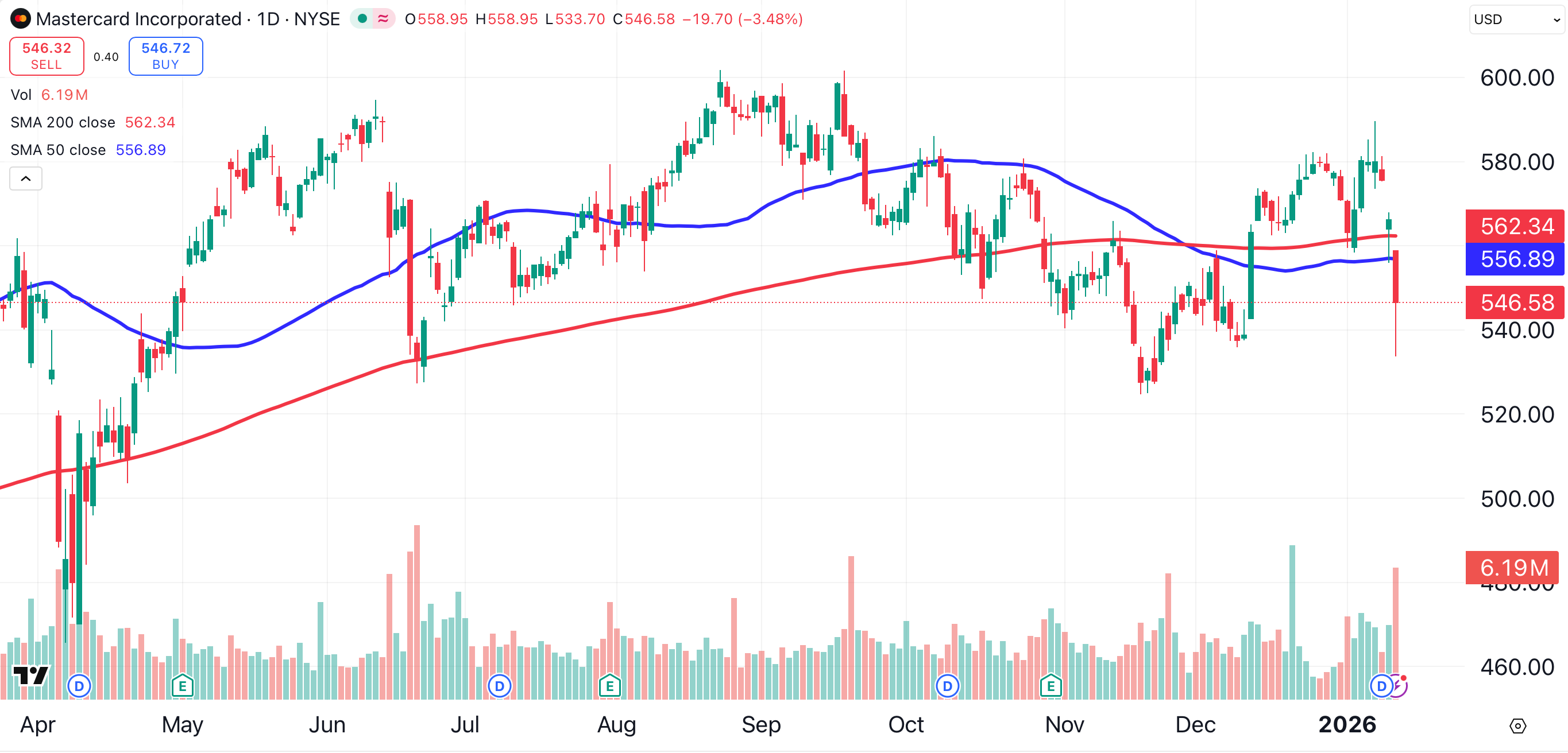 Shares of Mastercard were also hit for a 3.5% loss. Both Visa and Mastercard are trading below their key 50-day (blue) and 200-day (red) moving averages, a negative sign.