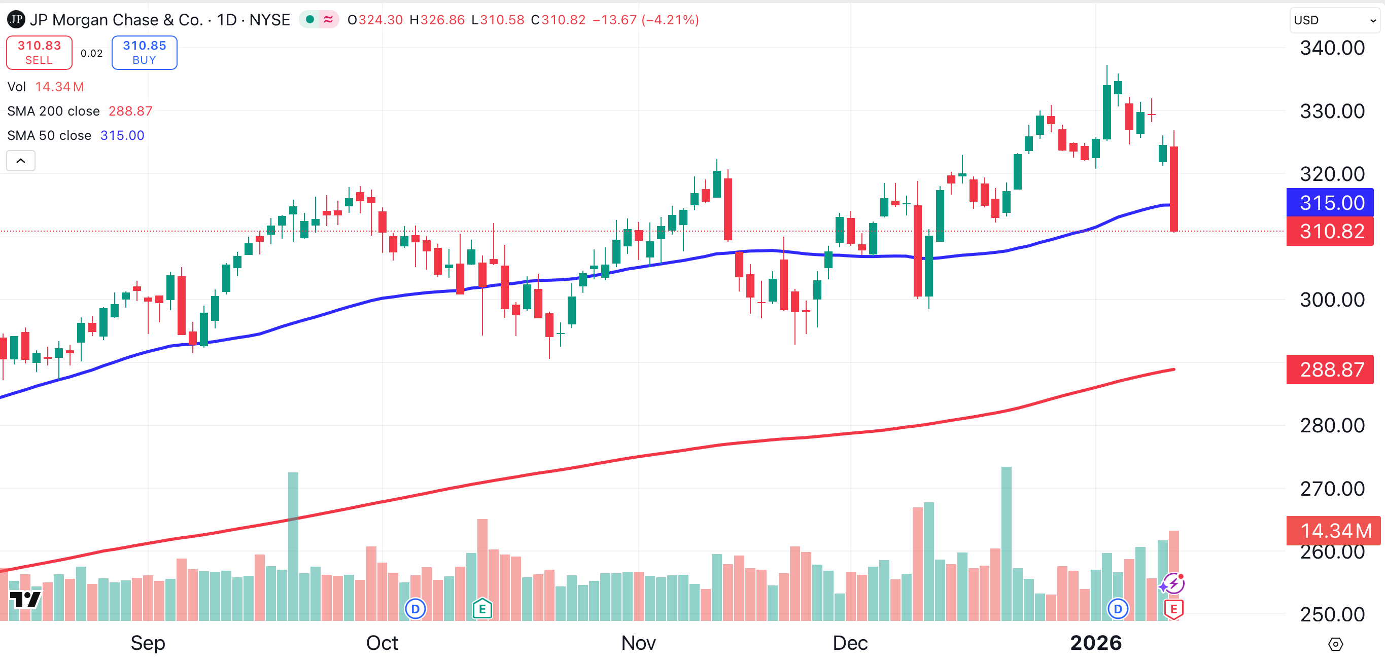 Like Capital One, JPMorgan Chase (JPM) traded at an all-time high last week. The stock lost 4.2% on Tuesday and has fallen below its 50-day moving average (blue). Last year, JPMorgan shares returned over 40%, after rising 26.85% in 2024.