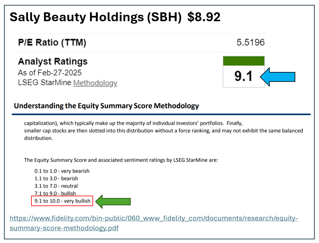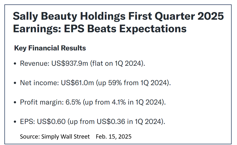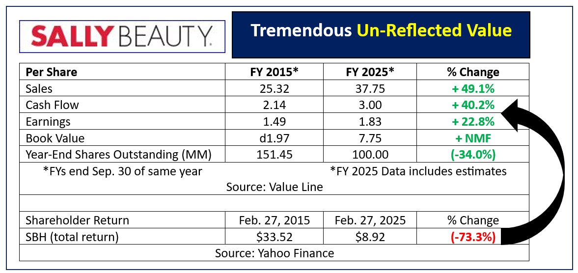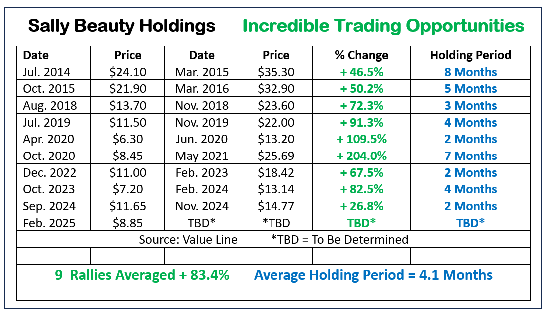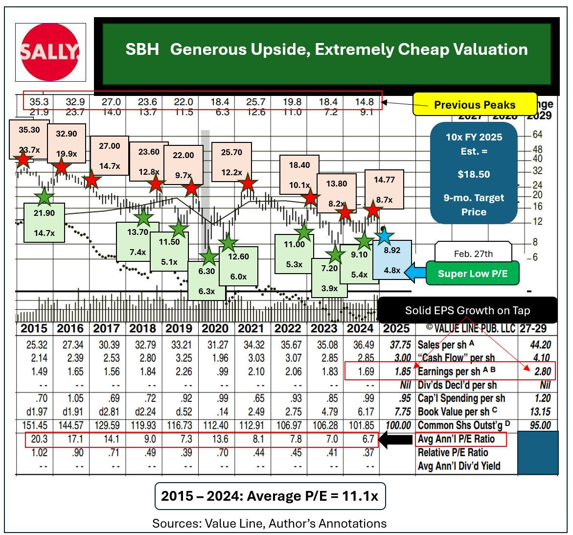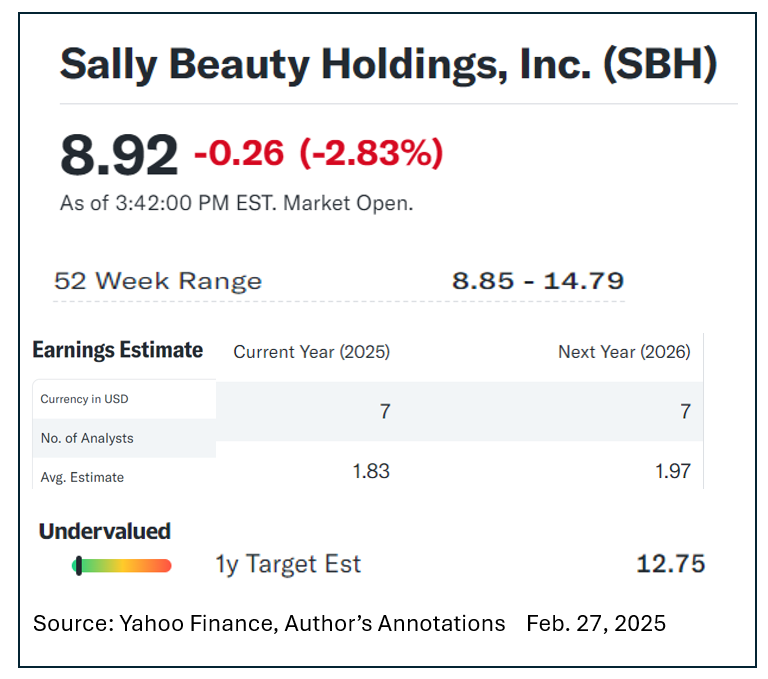 Sally established a new cyclical low of $8.85 intraday on Thursday Feb. 27, 2025. SBH was down 40% from a Nov. 26, 2024, peak of $14.77 just three months earlier.