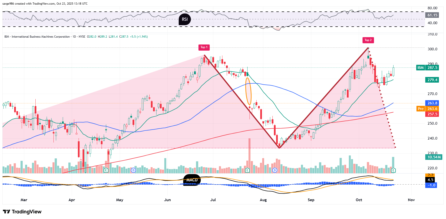 I wrote a piece a few weeks ago with a trade idea that would have gotten traders long IBM at a net basis of $296.60 with an out at $275. Anyone who followed that trade suffered a loss of 7.3%. My apologies. At the time, I saw a battle between two competing patterns, a cup with handle, which would have been bullish, and a double top pattern of bearish reversal. Needless to say, the double top won that fistfight.