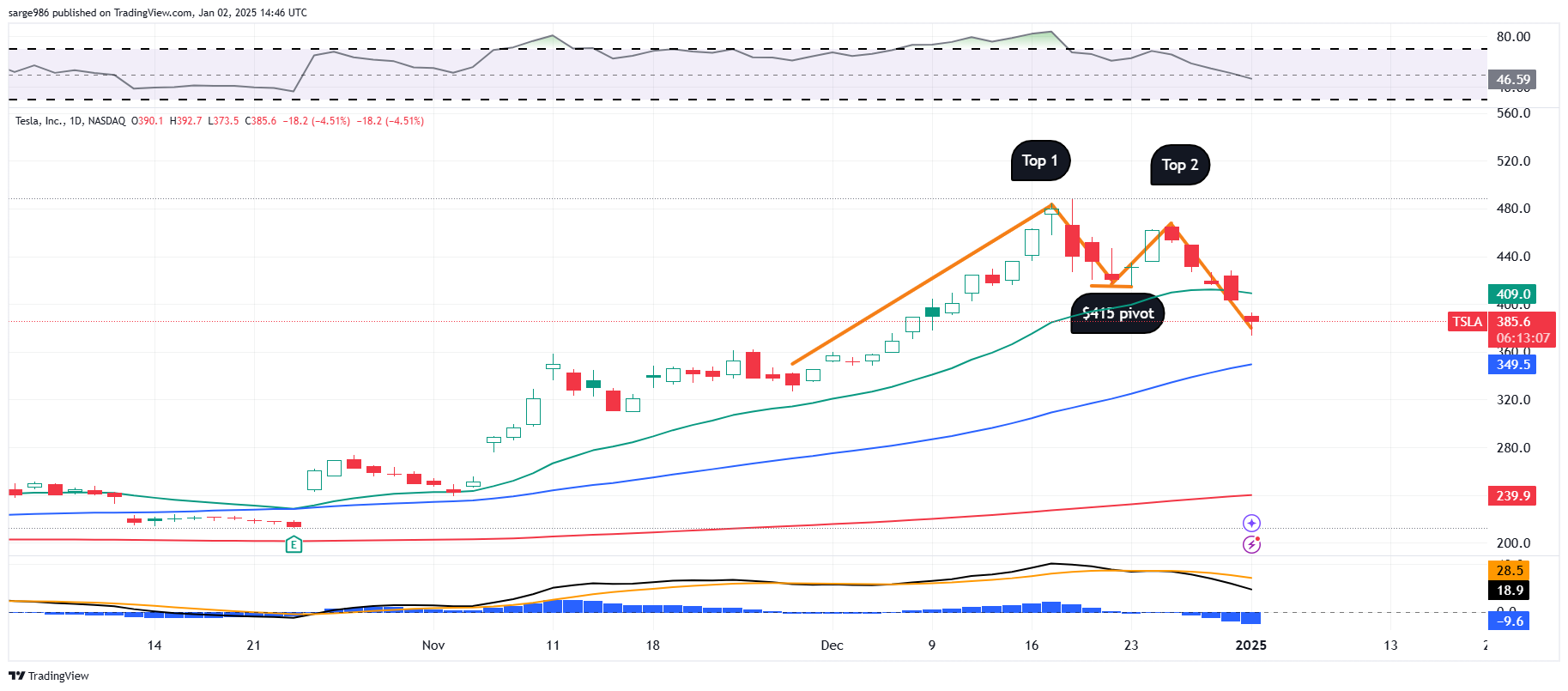 Are we looking at a double-top reversal pattern with a $415 pivot? That would put my target price to the downside close to $352. Relative strength is falling and the daily Moving Average Convergence Divergence indicator is clearly bearish.