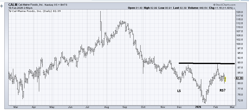 I think it’s possible that Cal-Maine Foods (CALM) is trying to make a head and shoulders bottom. A solid move back under 80, and I’m probably wrong.