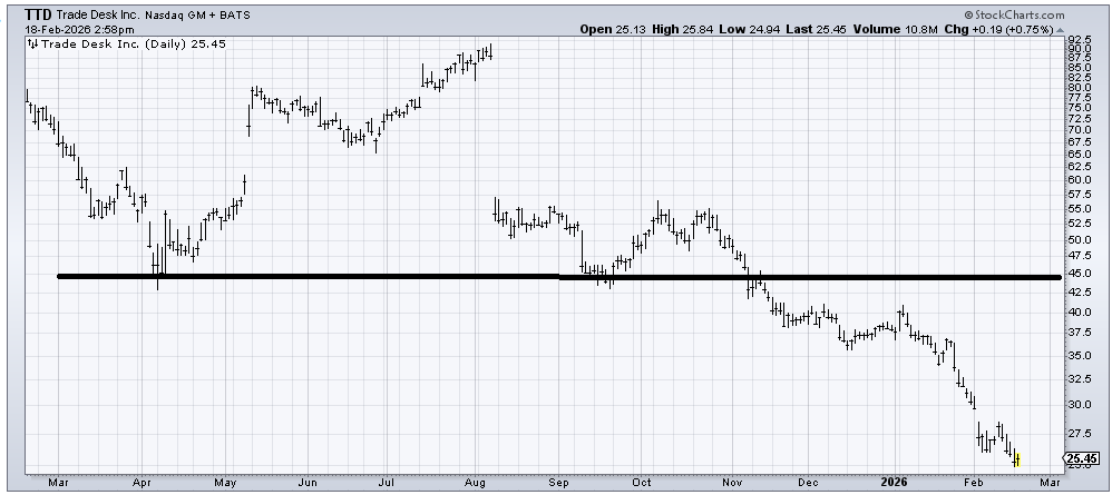 Sometimes I look at a chart, and I do the math on where the measured target is, and I say to myself, "That can’t be right." Trade Desk (TTD) is one of those charts. Why? Because the top it broke down from in November measures to zero. Notice it hasn’t really had a panic move since this whole software breakdown occurred. It’s just been steadily down.