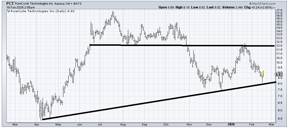 Pure Cycle Technologies (PCT) bounced right off the line, so sure, we know that’s the stop area. I suspect PCT will need to do some work down here (you see the November/December plodding back and forth?) even if this turns out to be a low. Earnings are next week, which makes it a crap shoot, but if the stock can rock back and forth for a bit, I think it improves it.