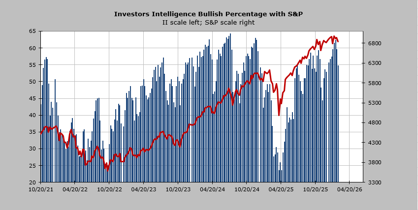 Then there is the Investors’ Intelligence Bull/Bear Ratio. It, too, has come down from that extreme reading over 4.0 a few weeks ago. It is now down enough for me to say folks are bearish, but the good news is the bulls are down to a smidge under 55% (they were 62% three weeks ago), so we’ve seen them pull in their horns.
