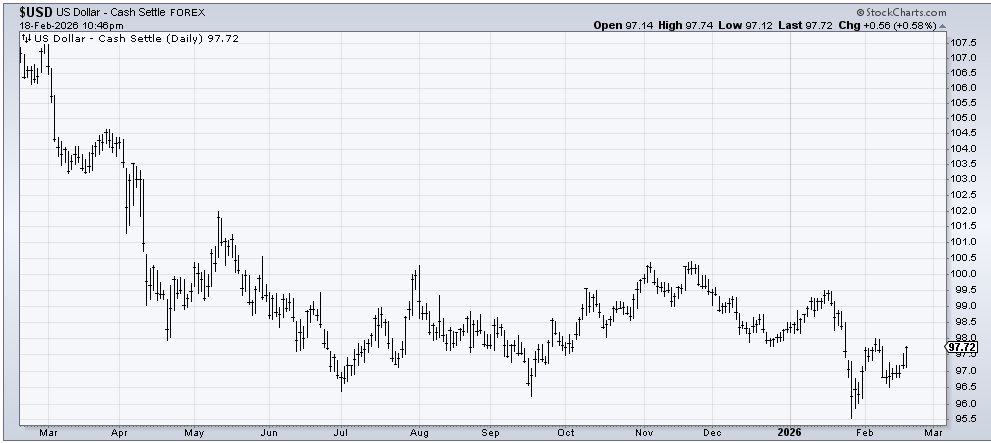 Finally, take a look at the chart of the Dollar Index. That waterfall decline in January is what I believe helped propel the 493 upward. So if the buck rallies, I submit the 493, which are overbought, will need to back off.