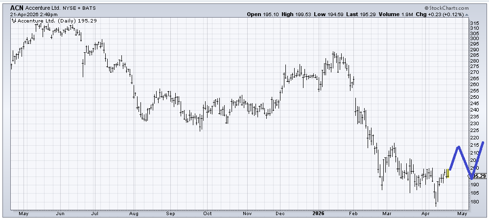 If Accenture (ACN) can map out something akin to what I’ve drawn in blue, then I might warm up to it. But right here and now, all I see is a stock desperately trying to form a bottom and yet hasn’t been able to make a higher high. The first sign that the buyers are interested would be a rally over 200 because that would be the first minor higher high in 2026.