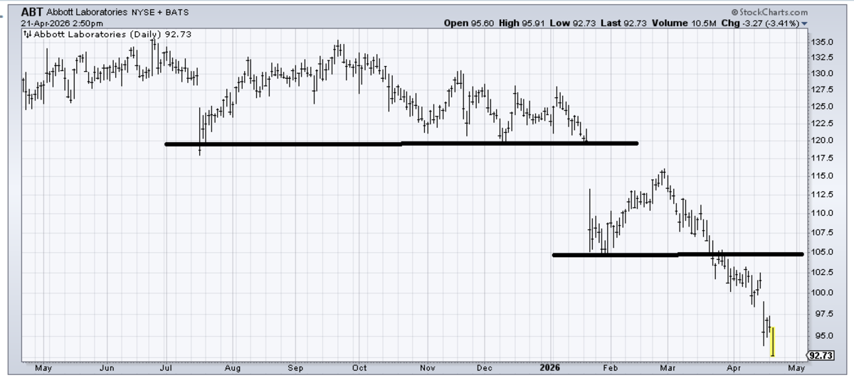 Abbott Labs (ABT) has not had a rally attempt in nearly two months, so it is oversold, but that is the best I can say about it. The stock is in a downtrend, and it’s hard to even want to bottom fish in it.