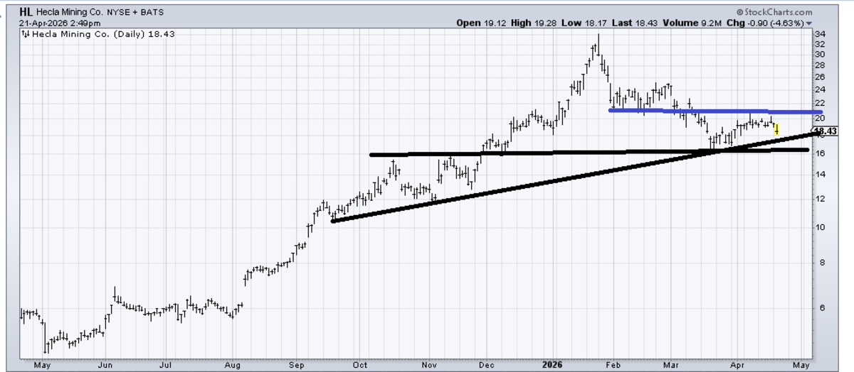 I should reiterate that I do think Silver had a bubble that burst back in January, which ought to mean that Hecla (HL) isn’t going to be a great chart. You can see how it has come down in layers. That having been said, I suspect if it gets into that 17-18 area, it will bounce again just because of that uptrend line. If it breaks 16, I am wrong.