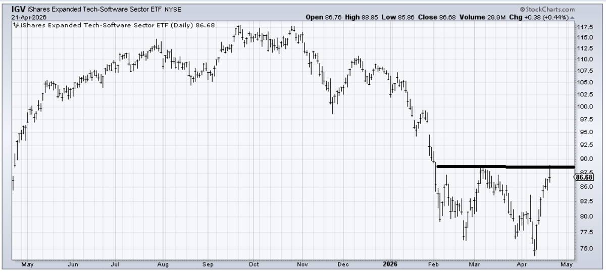 (IGV) finally made it to the March high. I would like to see it pull back and rally again. Because it would be a rally from a pullback that would tell us a lot more about where it stands: was this all short covering, or will there be buying? I lean neutral on the group now.
