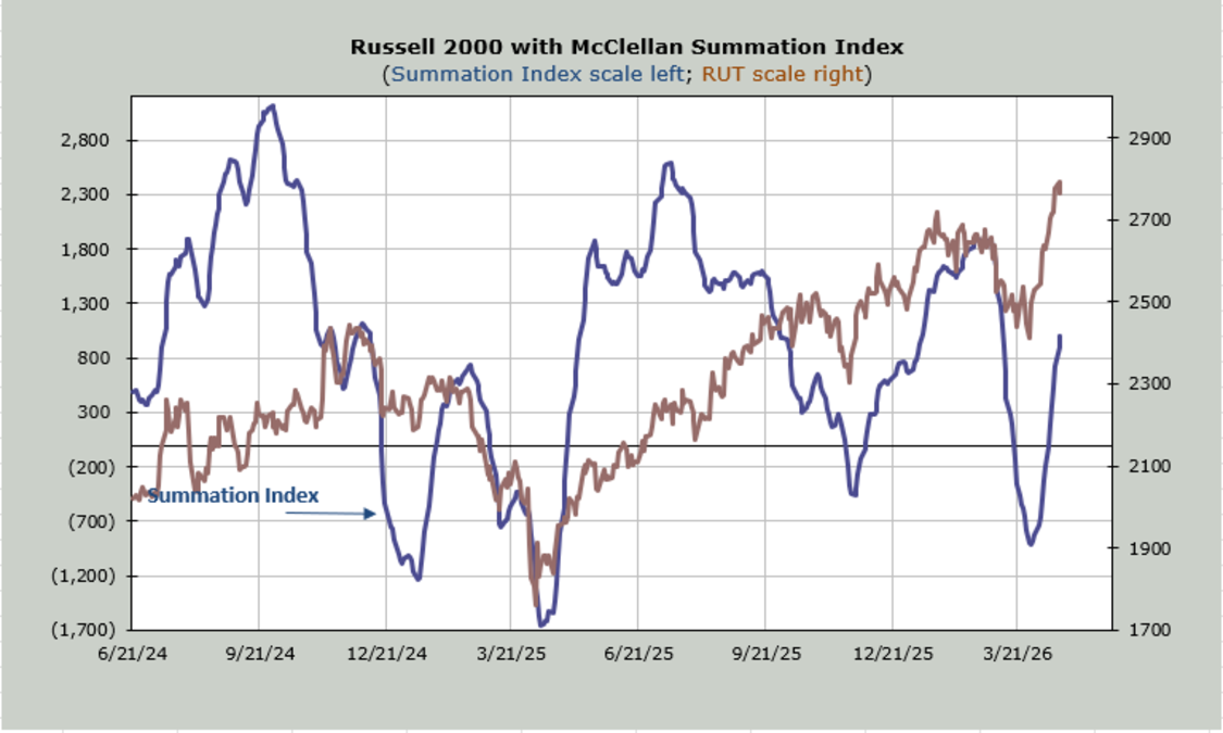 The McClellan Summation Index is discussed above. It would need a net differential of -1500 advancers minus decliners on the NYSE to halt the rise.