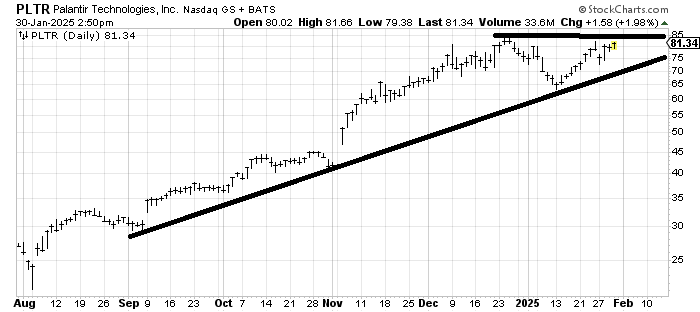 I believe I looked at Palantir PLTR a few weeks ago and did not like it and thought it would fail on a rally to the upper 70s so I’m already wrong on this fan favorite. Earnings are out next week and I shy away from playing earnings so I’ll just say if it gets over the prior highs at 85 it would be a breakout.