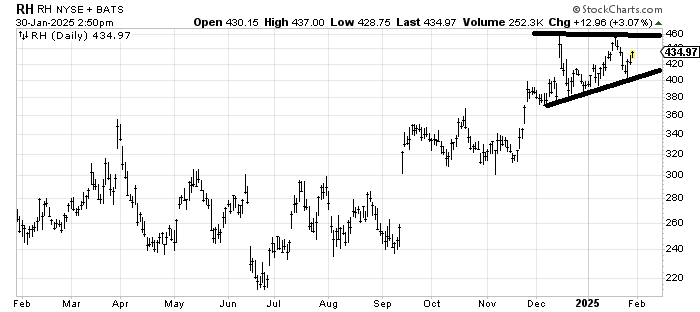 RH RH hasn’t done anything wrong after that big gap up on earnings in December. Oh sure, it failed to make a higher high but it has made higher lows. Under 400 would be bothersome to me. If it gets up to 460 again and can’t get over I’d worry.