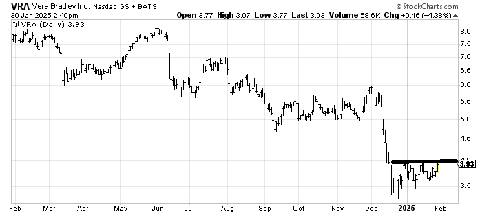 Vera Bradley VRA has no base to speak of but that small one over the last six weeks is intriguing for a trade to around 4.50. Just a trade.