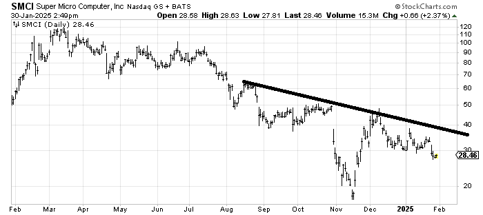 The best news I can offer for Super Micro Computer SMCI is that the big top it broke down from measured to 20 and when it got under it it left an island reversal down there. Does it bounce from here? Hard to say. It’s probably short term oversold from that move down but there is a lot of resistance all the way up. And earnings are out any day so it’s a gamble here. I would prefer to see more of a pattern set up. Like at least a higher low or higher high, something it hasn’t done in quite some time.