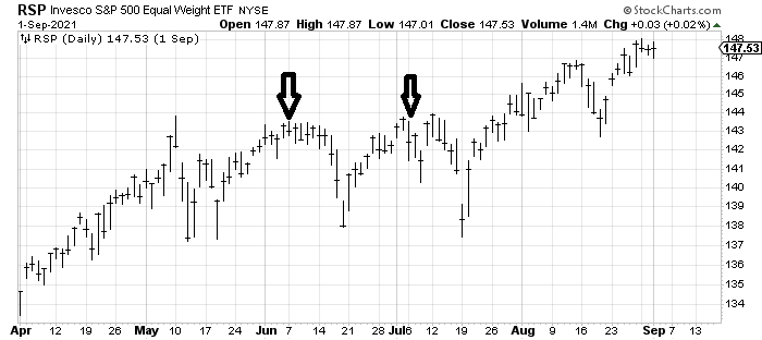 There are two prior low readings from 2021 on the chart so I took a look at what happened to the equal weight S&P at those two instances. They were a month apart (unusual) and each time the reaction was not immediate but as you can see we did get a short-term tumble of about 3-4%.