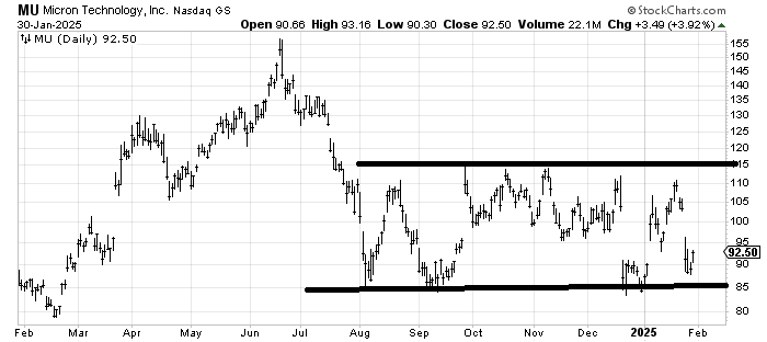 I was asked about Micron MU in mid December when it first gapped down and I was non-plussed by the action. I am still non-plussed because the stock has been in wide trading range for six months now.