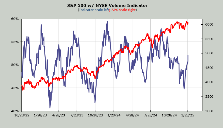 Right now, the intermediate-term indicators are still not overbought. For example, as I noted yesterday I expect the Volume Indicator will get overbought sometime in early February. To get overbought, it needs to get to the mid-50s. It is currently at 52%.