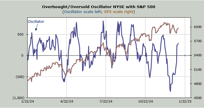 The Overbought/Oversold Oscillator I use is overbought. That’s because breadth has been positive for seven of the last eight trading days (this indicator is based on breadth). Recall we discussed how many stocks made their lows on the FOMC Day.