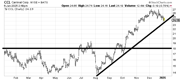 Carnival CCL has had a great run but it had good news a few weeks ago and it could not breach 27 which tells me there’s a lot of good news priced in now. It hasn’t broken the uptrend line yet but I’d lean toward profit taking in this stock.