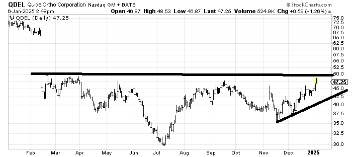 QuidelOrtho QDEL is a pretty base. It’s run quite a bit (25%) in the last month, so as it reaches resistance I think it will be tough to get through. But if we can get a pullback this week/next week into that 43 to 45 area I would be a buyer with a stop under the uptrend line.