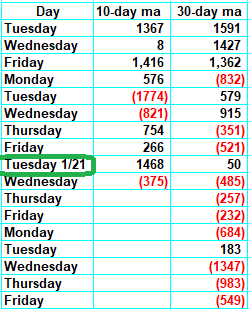 So, let’s take a look at the long string of positive numbers to be dropped off both the 10- and 30-day moving average lines this week (it’s a weird week, with Thursday being a market holiday). But take a gander at what we’re looking at the week of January 21 (circled in green). Imagine if we get breadth negative for the next several days. It need not be every day but many of them, then we’d be looking at both the 10- and 30-day moving average lines being oversold at the same time. That is what tends to produce a good rally.