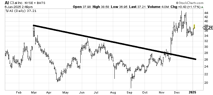 C3.ai AI has a great ticker symbol. It also broke out of a big base in November and met its upside target. If it can go sideways for some time now then I would like it again but right here it is in the middle of nowhere and a break of 34 would look to me like a retest of that breakout is in order. Sideways between 34 and 44 would be the most bullish thing it can do now.