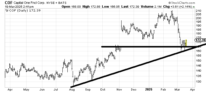 Capital One COF filled that gap from November, which is a positive. There is resistance at 175, but my inclination is that as long as it stays over 160-ish, it ought to be okay since this is the first real correction it has had in more than a year.