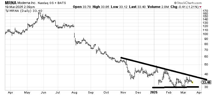 Moderna MRNA has not made a higher high in nearly a year. I’d love to bottom-fish it, but unless/until it can make a higher high, the stock is in a downtrend.