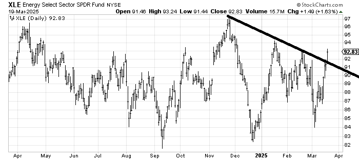 I want to follow up on XLE which I liked a week or two ago with the idea it might cross this line. It has. It also has resistance up here in the 92-94 area, so I’d look to buy a pullback to the line.
