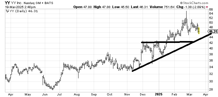 JOYY YY is not my kind of chart because it is up so much already and has that spike high at 55 to contend with, but it ought to bounce off that 44-ish area since it has bounced off that line since November.