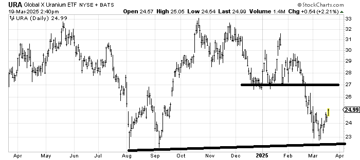 I was asked about NLR, an ETF to be long Nuclear/Uranium, but it trades quite thinly and looks just like URA, an ETF to be long uranium, so I’d rather use URA. It bounced off support and looks to me like it ought to make its way toward resistance at 27, but getting through that resistance over 27 is going to be tough. The equivalent area is 82-84 on NLR.