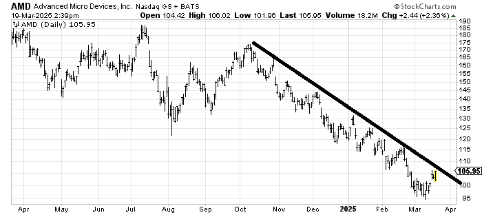 Advanced Micro Devices AMD hit its downside-measured target when it got to 100. But it hasn’t made a higher high since October. If AMD can cross this line and get to the 110-115 area, then pull back and rally again, I’d start to believe it was trying to bottom.