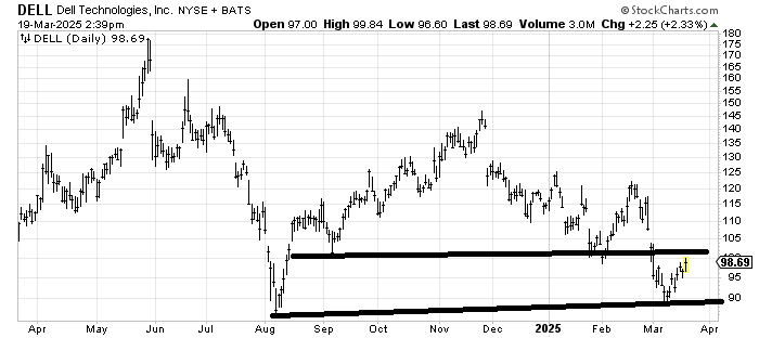 Dell Technologies DELL has a lot of resistance, starting right here at 100. There is a decent chance it fills that gap at 107, especially if a pullback from 100 is shallow.
